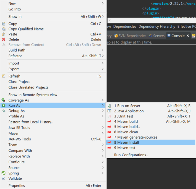이클립스에서 메이븐 프로젝트 우클릭 > Run As > 8 Maven install 클릭